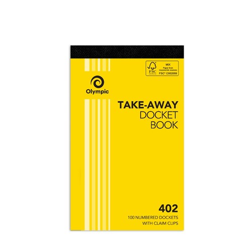 Olympic Cafe Docket Range are ideal for use in cafes, restaurants and take-away food stores 93 x 150mm 100 Numbered dockets with claim slips Sequentially numbered Ideal for use in take-away shops & fast food outlets to quickly & conveniently take phone & table orders Staple bound