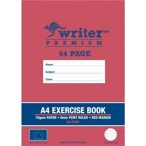 Writer Premium Exercise Books feature heavy duty covers, high quality white 70gsm paper with blue ruled lines and a red margin Unique cover colours and teachers references make each book easy to recognize Writer Premium Exercise Books also include an activity page, maths tables and conversion charts The Premium choice for all your school work
