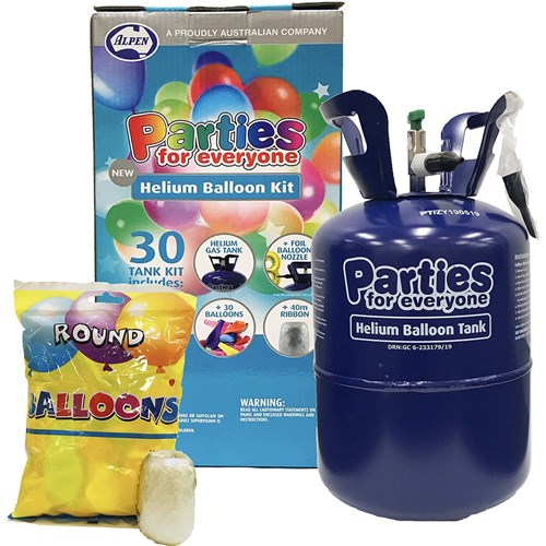 Compliant with the ACCC regulations for safety. This product contains approximately 79 percent Helium and 21percent +/-1percent Oxygen for safety purposes. This kit comes with 30 balloons and 40m of white ribbon. This kit will fill approximately  30 x  23cm latex balloons OR  16 x 28cm latex balloons. Latex Balloon float time is approx. 5-7 hours. Prolonged float times can be achieved by using Alpen's XtraFloat, Float Time Extender. This product is not suitable for inflating foil balloons. This tank contains 7L / 0.196 cubic m of the helium/oxygen mix. WARNING: Do not inhale, may cause suffocation. Alpen do not support the release of helium filled balloons into the atmosphere. When using this product, you are also encouraged to follow these guidelines and secure your balloons to a ribbon and weight. .