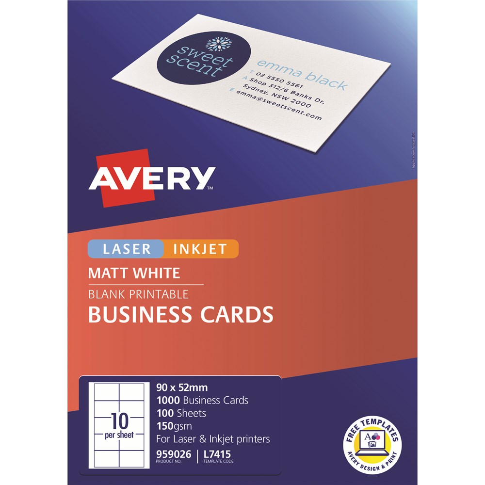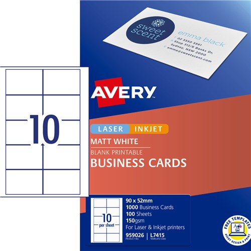 Micro-perforated sheets allow you to easily separate each business card. Cards are instantly available, saving you time. Bulk pack of 100 sheets are perfect for frequent users who require many business cards or those creating for different people in the office. Save money by only printing the number of cards you need. Customise your labels with Avery Design and Print, available at averyproducts.com.au/print. Size: 90 x 52mm 1000 cards, 100 sheets. 10 cards per sheet (10UP).