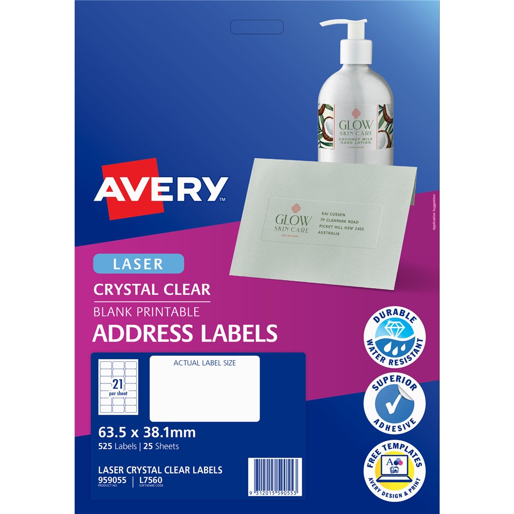 Avery Crystal Clear Laser Address Labels White L7560 63.5x38.1mm 21UP 525 Labels