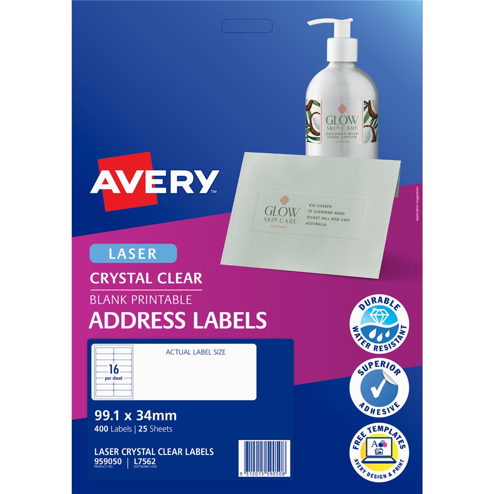 Premium glossy clear material is 100 percent transparent. Virtually disappear when applied to white and coloured surfaces. Jam-Free reliability for trouble free printing, saving time and minimising wastage. Ideal for envelopes, letters and product labelling. Made in Australia. Size: 99.1x34mm 400 labels, 25 sheets. 16 labels per sheet (16UP).