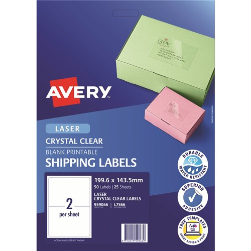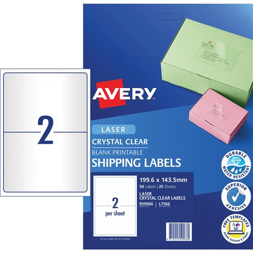 Made from durable material, which is oil, dirt, splash and tear proof. Clear labels virtually disappear when applied to white and coloured surfaces for a printed on look. Jam-Free reliability for trouble free printing, saving time and minimising wastage. Ideal for sending elegant parcels, gifts and boxes. Made in Australia. Customise your labels with Avery Design and Print, available at averyproducts.com.au/print. Size: 199.6x143.5mm 50 labels, 25 sheets. 2 labels per sheet (2UP).