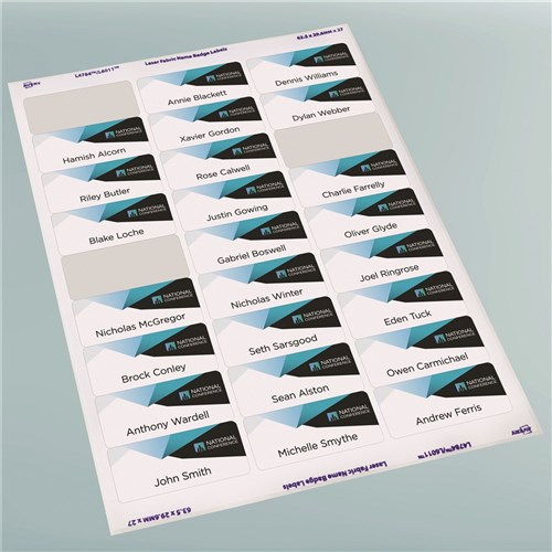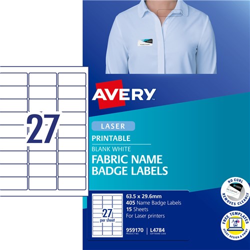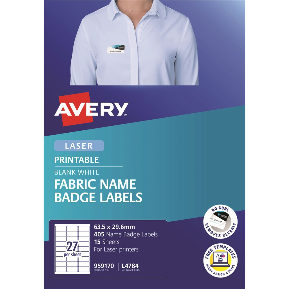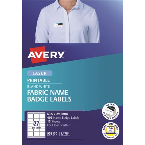 Ideal for seminars, meetings, trade fairs, conferencing, training sessions, schools and childcare centres. Fabric material is made from flexible acetate silk, can be used on most textiles and removed without leaving residue. Label will move with the clothing, without curling or peeling. Jam Freeâ„¢ reliability for trouble free printing on laser labels. Keep your facility safer by creating name badges on demand for employees and visitors Customise your labels with Avery Design and Print, available at averyproducts.com.au/print. Size: 63.5x29.6mm 405 labels, 15 sheets. 27 labels per sheet (27UP).