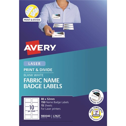 Avery Fabric Name Badge Laser Labels White L7427 88x52mm 10UP 150 Labels 15 Sheets