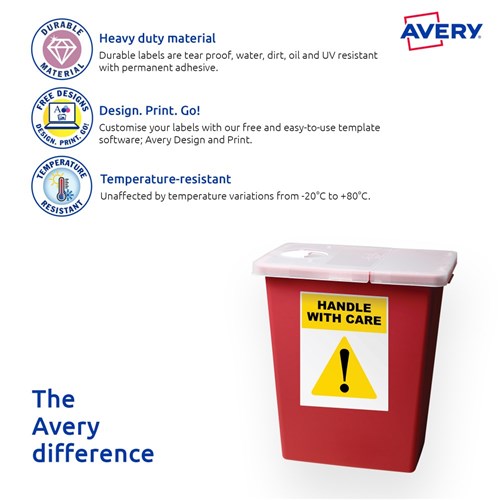 Heavy duty, waterproof, UV, oil and tear resistant unaffected by temperatures between -20°C to 80°C. Ideal for labelling equipment and organising property. Engineered to take on tough applications where a standard label is not fit for purpose. Customise your labels with Avery Design and Print, available at averyproducts.com.au/print. Made in Australia. Size: 99.1x38.1mm 350 labels, 25 sheets. 14 labels per sheet (14UP).