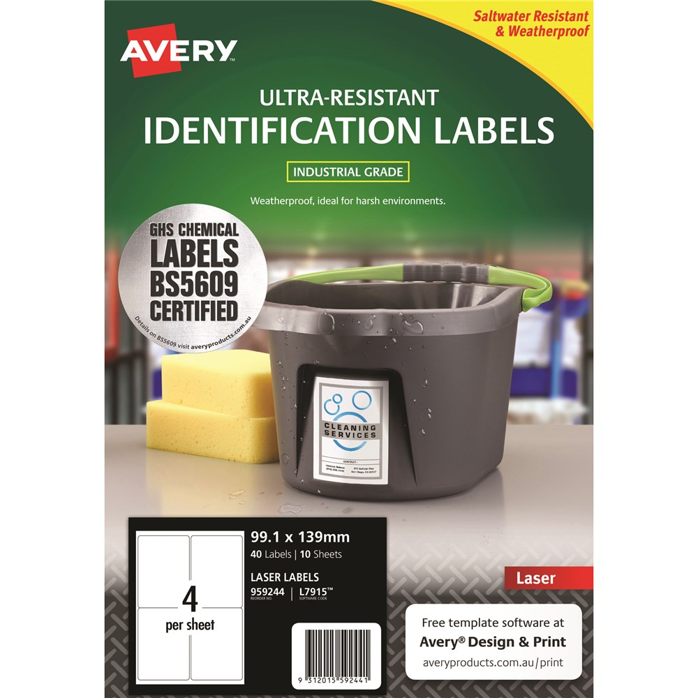 Ultra-Resistant Labels are saltwater resistant and certified for GHS Chemical Labelling with permanent adhesive and engineered to take on harsh environments. Unaffected by temperature variations -40?C to +150?C. Ideal for chemical labelling requirements and for onsite chemical decanting. Used in marine and harsh environments, ideal for safety signs, arc flash and tanks. Customise your labels with Avery Design and Print, available at averyproducts.com.au/print. Size: 99.1x139mm 40 labels, 10 sheets. 4 labels per sheet (4UP).