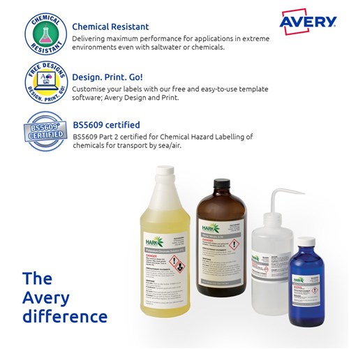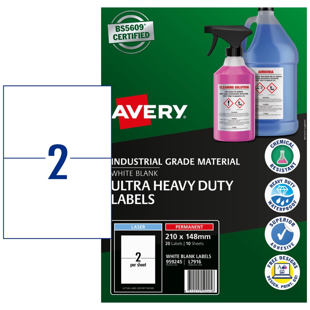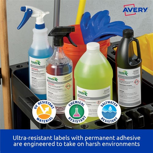 Ultra-Resistant Labels are saltwater resistant and certified for GHS Chemical Labelling with permanent adhesive and engineered to take on harsh environments. Unaffected by temperature variations -40?C to +150?C. Ideal for chemical labelling requirements and for onsite chemical decanting. Used in marine and harsh environments, ideal for safety signs, arc flash and tanks. Customise your labels with Avery Design and Print, available at averyproducts.com.au/print. Size: 210x148mm 20 labels, 10 sheets. 2 labels per sheet (2UP).
