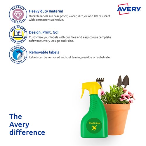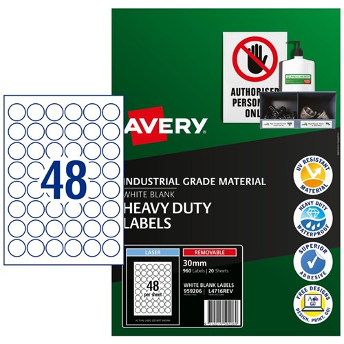 Weather, UV, oil and dirt resistant. Unaffected by temperature variations -20°C to +80°C. Removable adhesive formulated to adhere to a wide variety of surfaces without leaving residue. Ideal for creating temporary labelling of equipment, facilities and storage supplies, stock take and organising workshops. Customise your labels with Avery Design and Print, available at averyproducts.com.au/print. Size: 30mm diameter 960 labels, 20 sheets. 48 labels per sheet (48UP).
