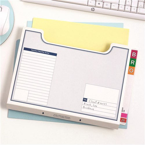 Feature printed panels on the covers to enable notes and related file information to be noted directly onto the file. Reinforced side tabs for easy colour code labelling. 40mm expansion. Open top wallet ideal for storage of loose documents. Size: 355x235mm.