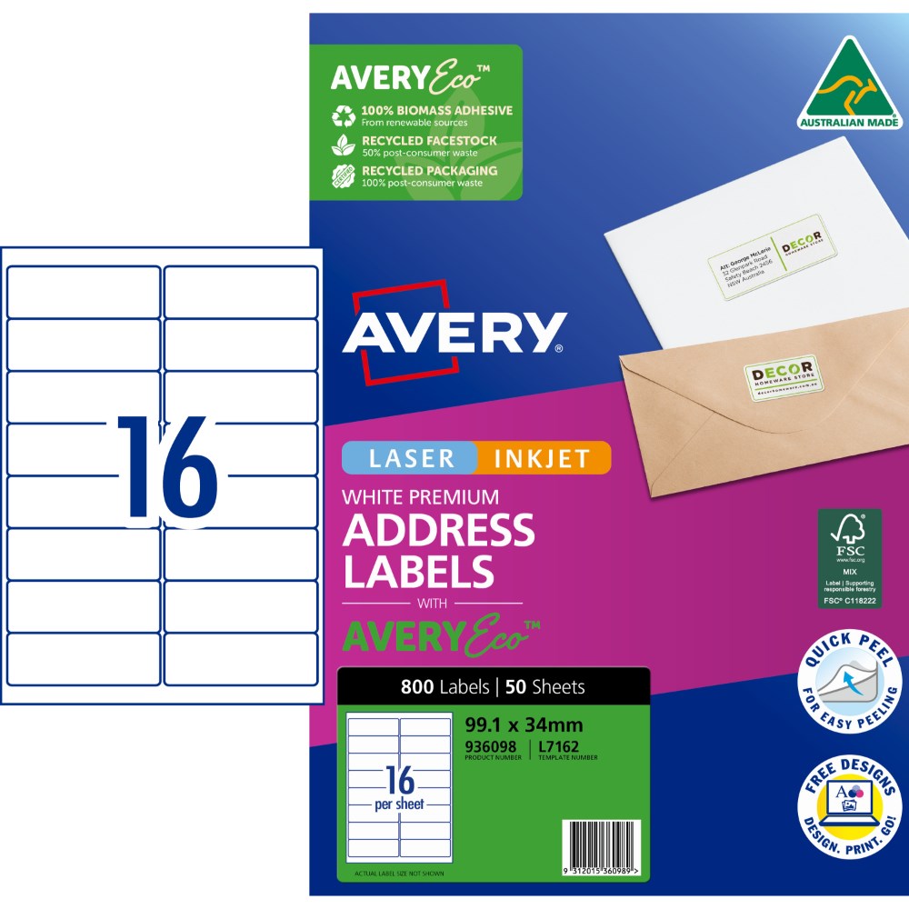 SureFeed™ technology is engineered to help provide a more reliable feed through your printer. Quick Peel™ technology allows for a quicker and easier detachment of labels from backing sheet for efficient application. Jam-Free reliability for trouble free printing, saving time and minimising wastage. A best-in-class superior permanent adhesive produced using a Biomass Balance approach, replacing fossil-based raw materials with renewables. Customise your labels with Avery Design and Print, available at averyproducts.com.au/print. Paper facestock made from 50 percent post-consumer waste. FSC certified. Packaging made from 100 percent recycled material. FSC certified. Made in Australia. Size: 99.1 x 34mm, 320 labels, 20 sheets. 16 labels per sheet (16UP). Suitable for high speed laser or inkjet printers and copiers.