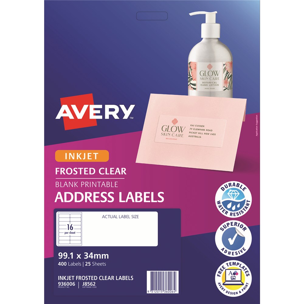 Ideal for parcels or boxes with a dark surface. Compatible with Inkjet printers and smudge-free for a professional finish. Labels provide a contemporary frosted clear finish. Made in Australia. Size: 99.1x34mm 400 labels, 25 sheets. 16 labels per sheet (16UP).