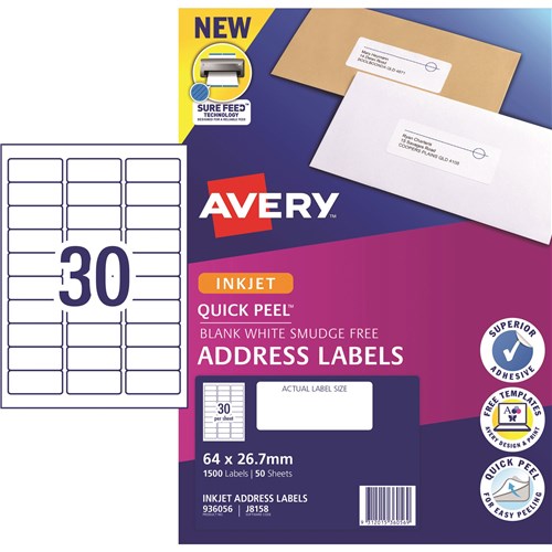 Ideal for addressing and shipping of letters parcels and boxes FSC certified labels made with paper from well managed forest Inkjet Labels guaranteed Smudge Freeâ„¢ printing on inkjet printers Supported by free Avery templates available at averyproducts com au/print Size: 64x26.7mm 1500 labels, 50 sheets. 30 labels per sheet (30UP)