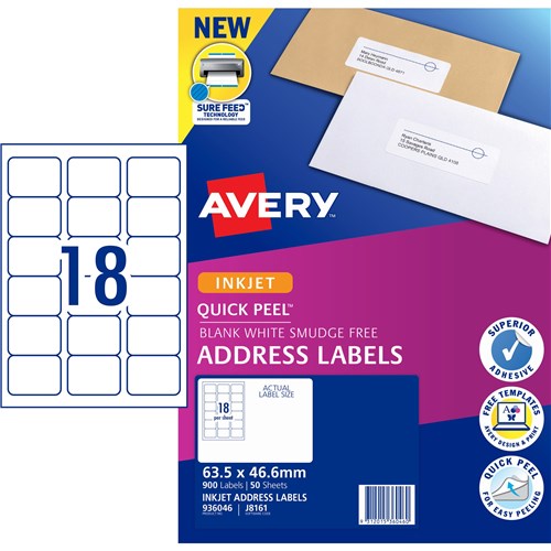 Ideal for addressing and shipping of letters parcels and boxes FSC certified labels made with paper from well managed forest Inkjet Labels guaranteed Smudge Freeâ„¢ printing on inkjet printers Supported by free Avery templates available at averyproducts com au/print Size: 63.5x46.6mm 900 labels, 50 sheets. 18 labels per sheet (18UP)