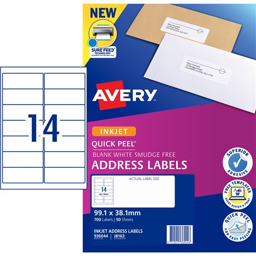 Ideal for addressing and shipping of letters parcels and boxes FSC certified labels made with paper from well managed forest Inkjet Labels guaranteed Smudge Freeâ„¢ printing on inkjet printers Supported by free Avery templates available at averyproducts com au/print Size: 99.1x38.1mm 700 labels, 50 sheets. 14 labels per sheet (14UP)