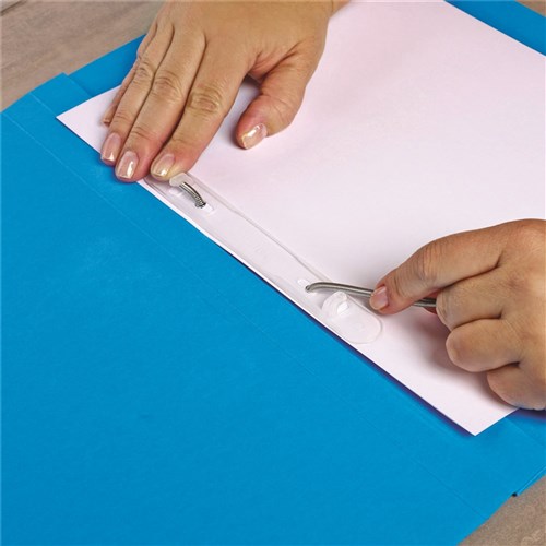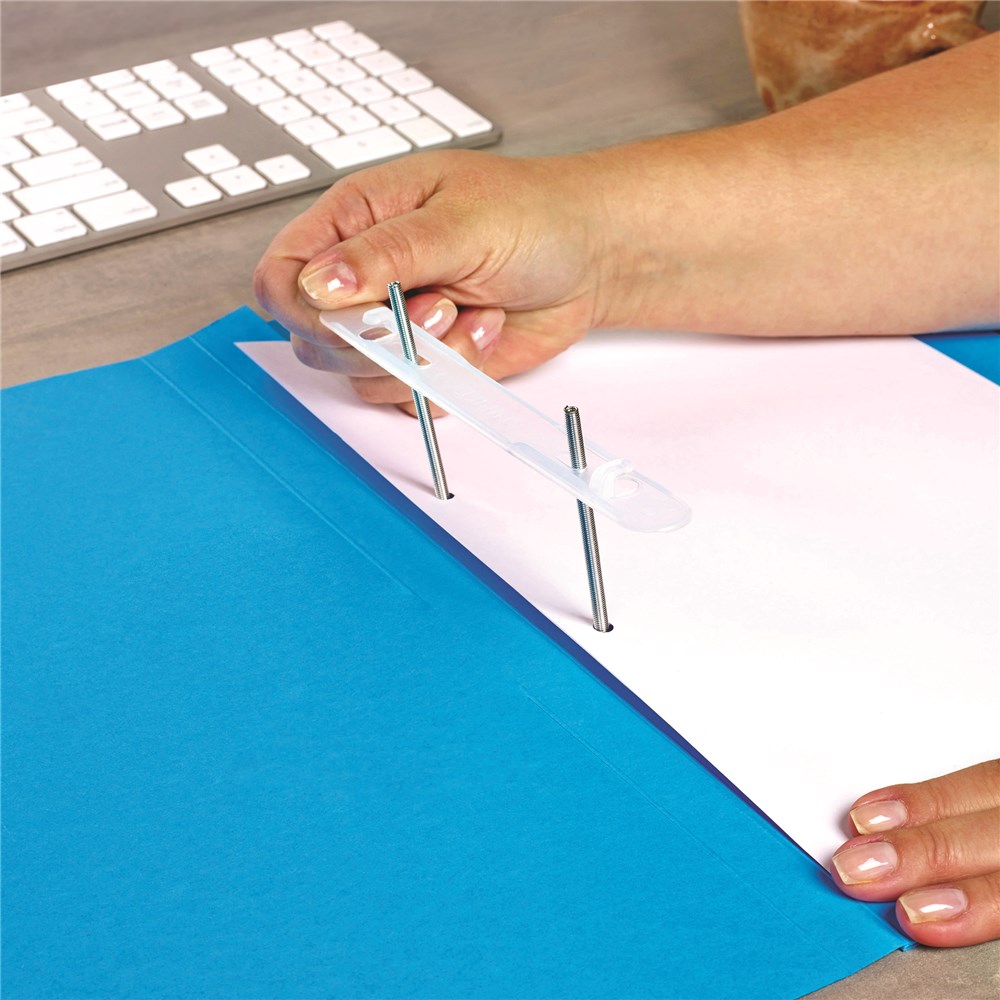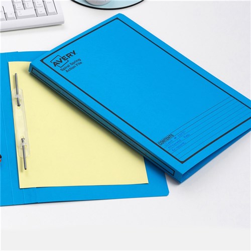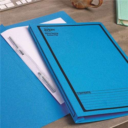 Heavy weight file fitted with spiral spring coil fastener and pressure plate. Easily add and remove pages from the top of the file. Foolscap size. Available in buff, red, blue green and yellow with black print.
