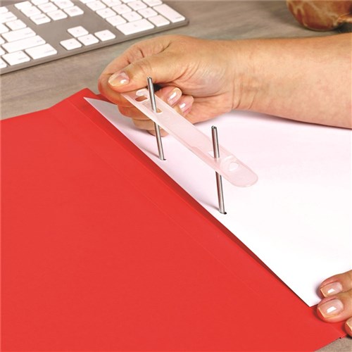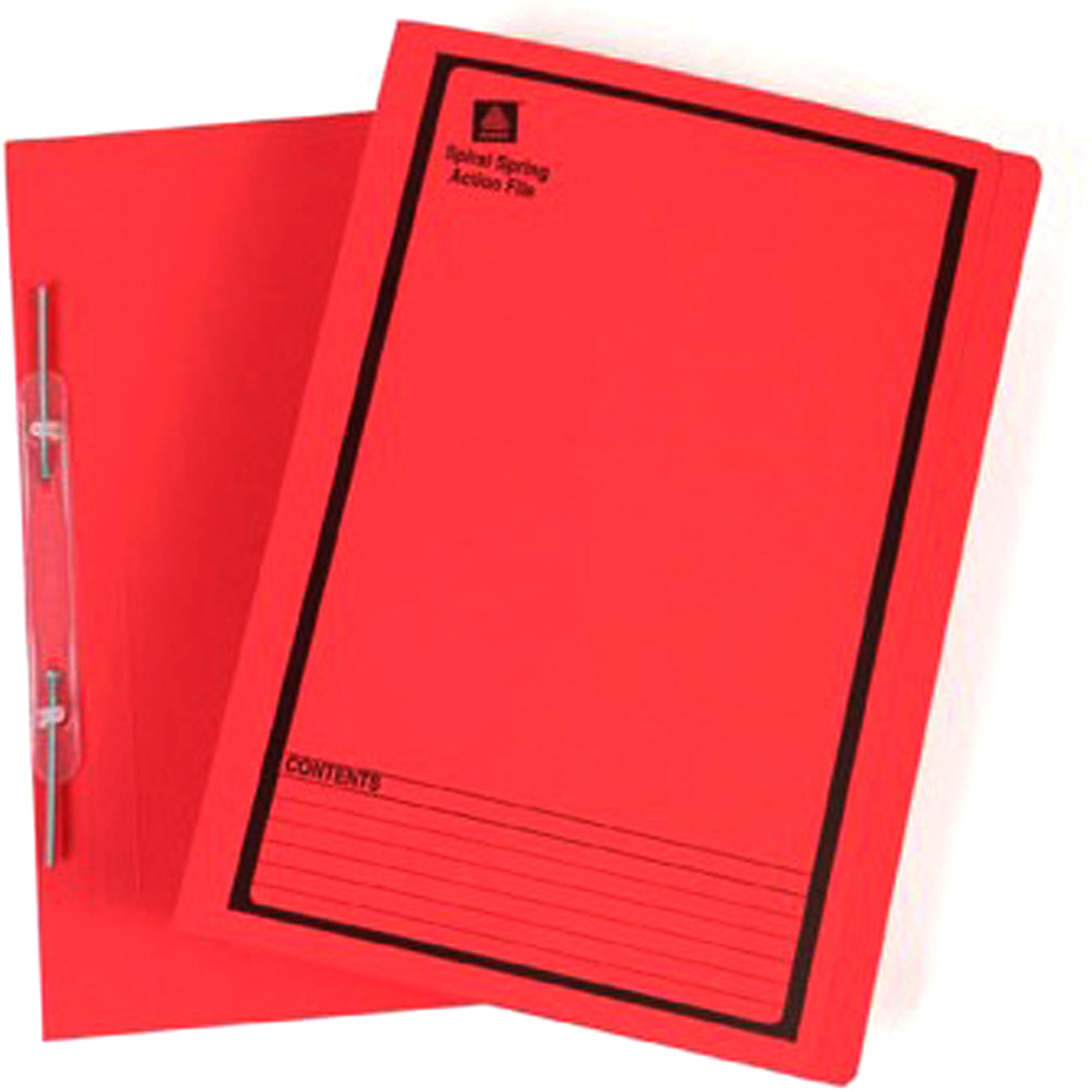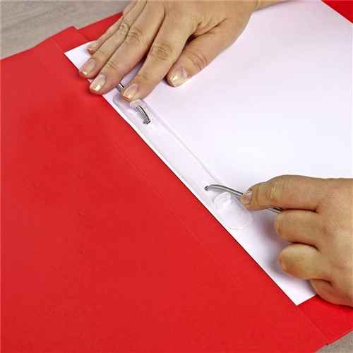 Heavy weight file fitted with spiral spring coil fastener and pressure plate Easily add and remove pages from the top of the file. Foolscap size. Available in buff, red, blue green and yellow with black print.