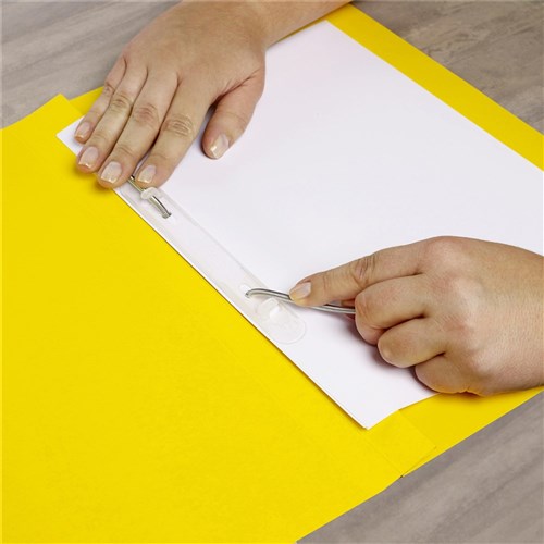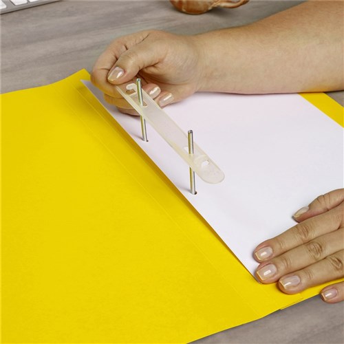 Heavy weight file fitted with spiral spring coil fastener and pressure plate. Easily add and remove pages from the top of the file. Foolscap size. Available in buff, red, blue green and yellow with black print.