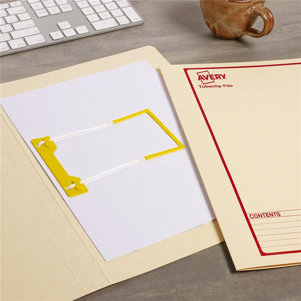 Heavy weight manilla file fitted with tubeclip® file fastener Tubeclip® design allows access to pages at any point within the file Foolscap size. Available in buff with colour print for a classic look, or coloured files with black print.
