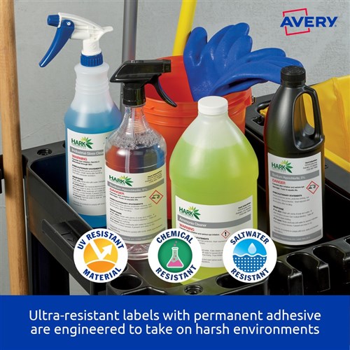 Ultra-Resistant Labels are saltwater resistant and certified for GHS Chemical Labelling with permanent adhesive and engineered to take on harsh environments. Unaffected by temperature variations -40?C to +150?C. Ideal for chemical labelling requirements and for onsite chemical decanting. Used in marine and harsh environments, ideal for safety signs, arc flash and tanks. Customise your labels with Avery Design and Print, available at averyproducts.com.au/print. Size: 63.5x33.9mm 240 labels, 10 sheets. 24 labels per sheet (24UP).