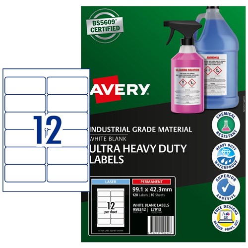 Ultra-Resistant Labels are saltwater resistant and certified for GHS Chemical Labelling with permanent adhesive and engineered to take on harsh environments. Unaffected by temperature variations -40?C to +150?C. Ideal for chemical labelling requirements and for onsite chemical decanting. Used in marine and harsh environments, ideal for safety signs, arc flash and tanks. Customise your labels with Avery Design and Print, available at averyproducts.com.au/print. Size: 99.1x42.3mm 120 labels, 10 sheets. 12 labels per sheet (12UP).