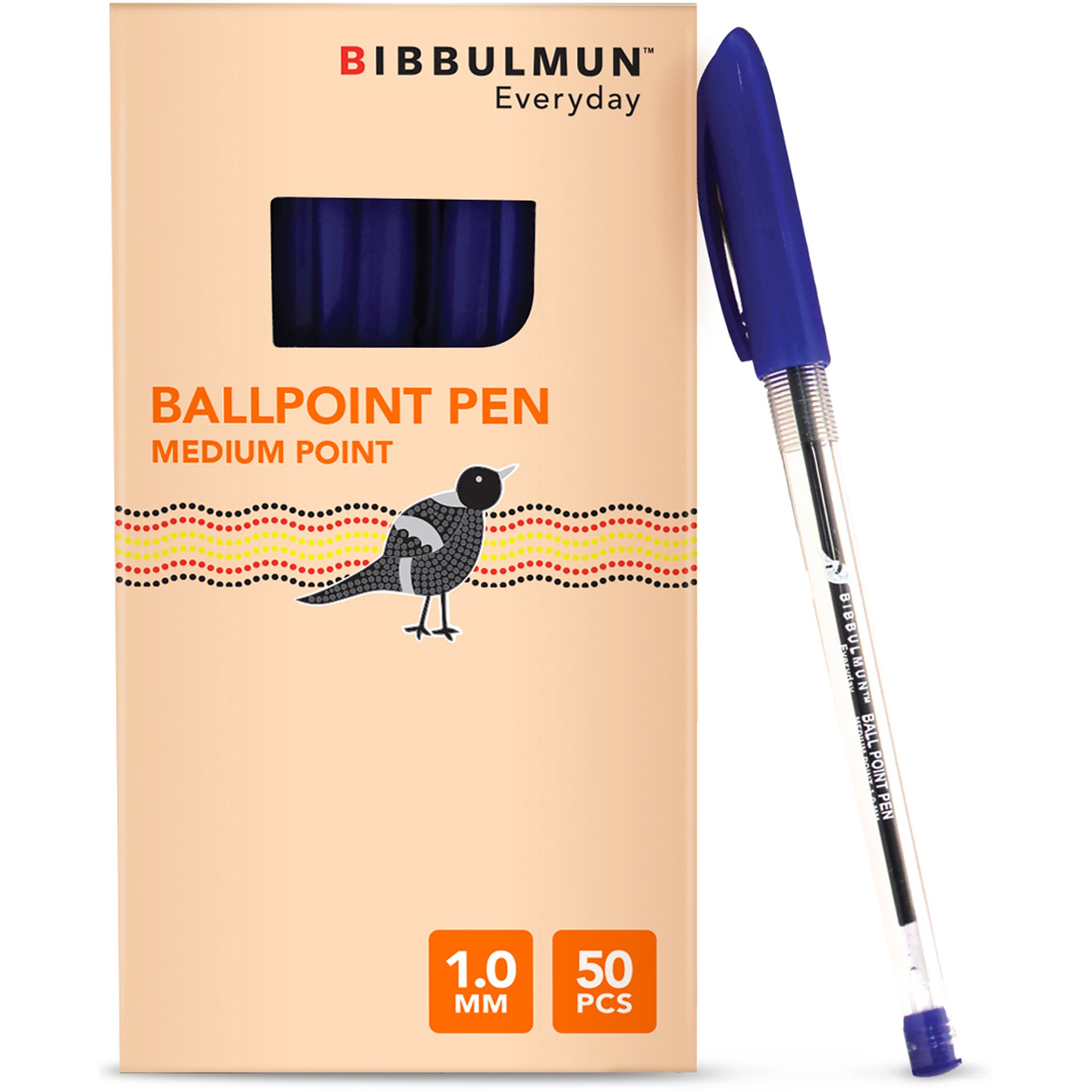 These pens are perfectly balanced for smooth and even writing. Medium 1.0mm. Ultra low viscosity ink. Available in pack of 50. Bulk buy and save. The Bibbulmun Range contributes part proceeds to the Bibbulmun Fund which supports Indigenous communities by using targeted programs to develop them in life-changing ways.
