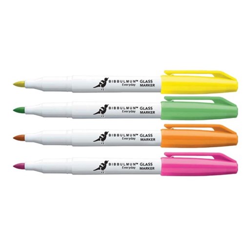 Non-permanent writing on glass surfaces such as mirrors and windows. Excellent for shop front advertisements. Colours included in this box are yellow, green, orange and pink. High colour brilliancy. Line width 1-2mm. Dry erase. Non-toxic.