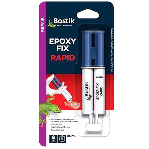 Rapid bonding incredibly strong, quick bonding epoxy. Heat, water, chemical and oil resistant, can be sanded and painted. Suitable for use on metal, wood, masonry, ceramics, glass, leather, rubber, chipboard, stone, plastic, concrete, cardboard, fabric and most plastics. Includes tray and spatula.