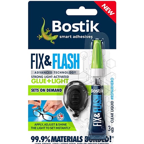 Fix and flash light activated glue, uses advanced technology to create an ultra strong and long lasting bond, that is flexible. Works on almost all opaque surfaces with the bond being repositionable until you shine the light so you can fix it just right. Solvent free and no odour. 99.99% materials bonded.