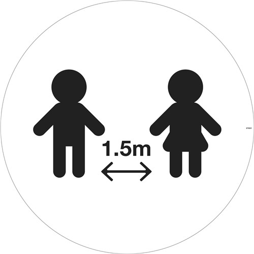 Wording: 'Kids 1.5M Picto' (White With Black Picto). Self-adhesive walk-on signs designed to bond to many different surfaces. Clear textured overlaminate protects warning message. Perfect for schools. Vibrantly coloured with an easily recognisable pictogram to ensure children are aware of the social distancing guidelines in effect. Suitable for internal use. Size: 300mm diameter.