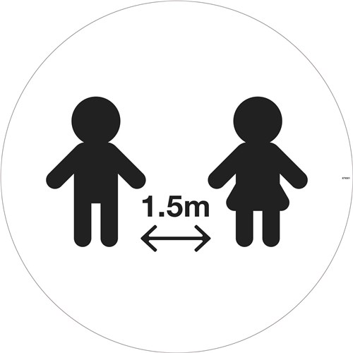 Wording: 'Kids 1.5M Picto' (White With Black Picto). Self-adhesive walk-on signs designed to bond to carpet. Clear textured overlaminate protects warning message. Perfect for schools. Vibrantly coloured with an easily recognisable pictogram to ensure children are aware of the social distancing guidelines in effect. Suitable for internal use. Size: 300mm diameter.