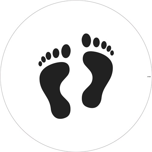 Wording: Stand Here 'Footprints' picto. Self-adhesive walk-on signs designed to bond to carpet. Clear textured overlaminate protects warning message. Vibrantly coloured with an easily recognisable pictogram to ensure children are aware of the social distancing guidelines in effect. Suitable for heavy pedestrian areas such as schools, nursing homes, and public areas which are carpeted. Easy to remove, just lift one edge of the marker and pull. Australian made. Size: 300mm diameter.