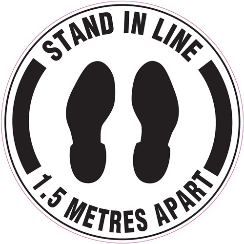 Wording: Stand In Line 1.5 Metres Apart (with footprint picto). Self-adhesive walk-on floor sign designed to bond to many different surfaces. Clear textured overlaminate protects warning message. Suitable for heavy traffic areas or wall mounting applications where graffiti or heavy wash downs are a problem. Easy to remove, just peel off the marker and wipe down the surface area. Suitable for internal use. Size: 300mm diameter.