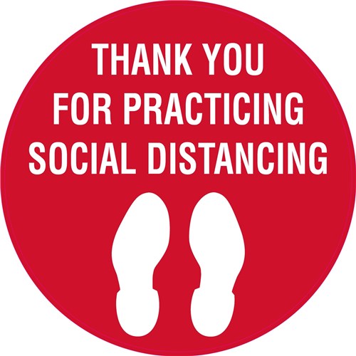 Size 300mm Diameter. Wording: Thank You For Practicing Social Distancing (with footprint picto). Self-adhesive walk-on signs designed to bond to carpet. Clear textured overlaminate protects warning message. Suitable for heavy pedestrian areas such as schools, nursing homes, and public areas which are carpeted. Easy to remove, just lift one edge of the marker and pull.
