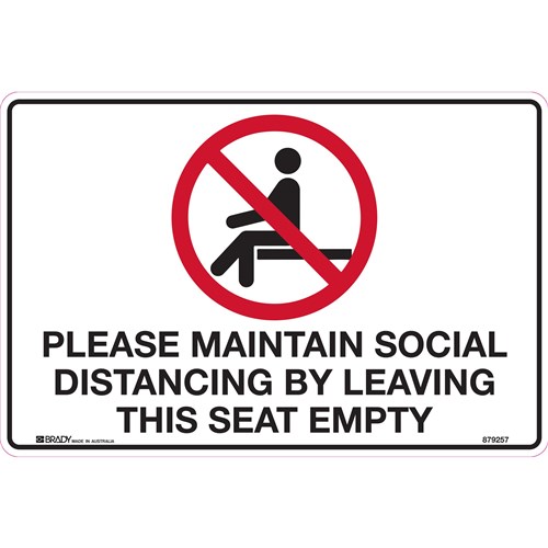Wording: Please Maintain Social Distancing By Leaving This Seat Empty. Colour: White, red and black. Material: Polypropylene. Complies to Australian Standard AS1319-1994. Prohibition signs specify behaviour or actions which are not permitted. Commonly found in offices, shopping centres and high traffic locations where specific actions could be potentially dangerous. Assists in communicating a message where there may be a worker or visitor with a language barrier. Size 450W x 300mmH.