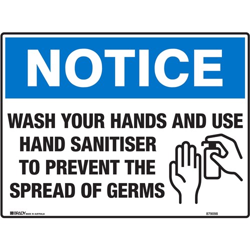Help minimise the spread of COVID-19 in your facility with Brady's range of hygiene signs, social distancing signs . Wording: Notice Sign Wash Your Hands And Use Hand Sanitiser To Prevent The Spread Of Germs. Material: Polypropylene. Size:H225 X W300mm.