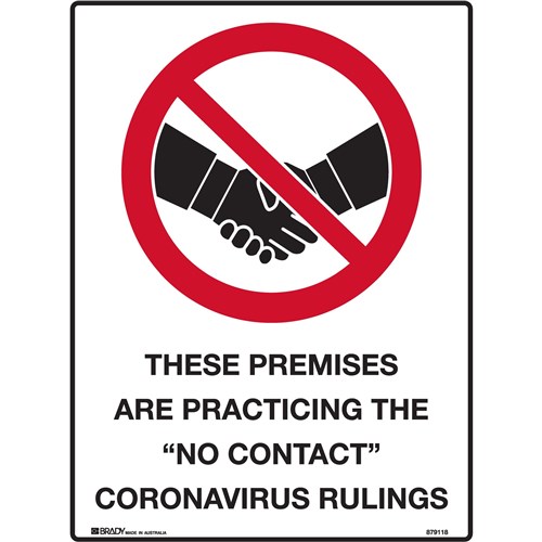 Help minimise the spread of COVID-19 in your facility with Brady's range of hygiene signs, social distancing signs . Wording: These Premises Are Practicing The 'No Contact' Coronavirus Rulings. Material: Multiflute Corrugated Plastic. Size:H600 X W450mm.