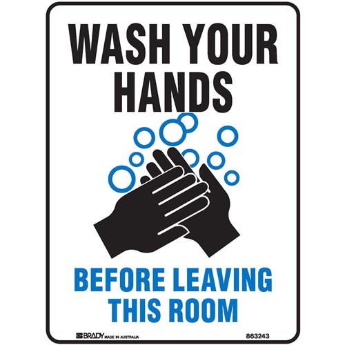 Help minimise the spread of COVID-19 in your facility with Brady's range of hygiene signs, social distancing signs . Wording: Wash Your Hands Before Leaving This Room. Material: Polypropylene. Size:H300 X W225mm.