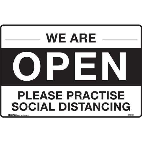 Brady Safety Sign We Are Open Practice Social Distancing H180xW250mm SelfAdhesive Vinyl