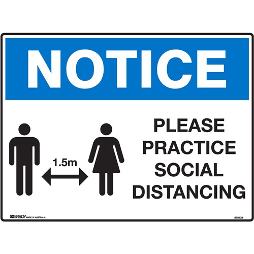 Help minimise the spread of COVID-19 in your facility with Brady's range of hygiene signs, social distancing signs . Wording: Notice Sign With Picto Please Practice Social Distancing. Material: Polypropylene. Size:H225 X W300mm.