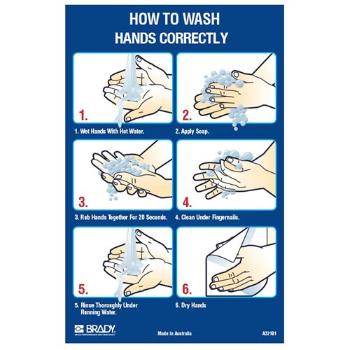 Help minimise the spread of COVID-19 in your facility with Brady's range of hygiene signs posters. Wording: How To Wash Your Hands Correctly 6 Step Guide. Material: Vinyl Banner Poster. Size:H594 X W420mm.
