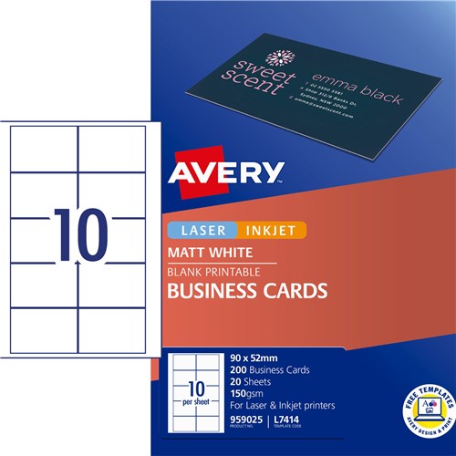 Create custom business cards instantly using your printer. Made of high quality card stock and can be printed in black or colour. Save time as cards are instantly available. Customise your labels with Avery Design and Print, available at averyproducts.com.au/print Size: 90x52mm 200 cards, 20 sheets. 10 cards per sheet (10UP)