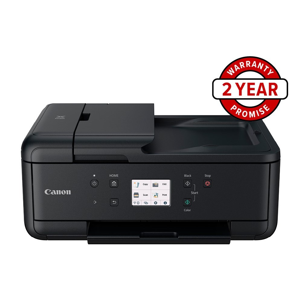 Print, copy, scan and fax. Print Resolution: 4800 (horizontal) x 1200 (vertical) dpi. Document Print Speed: 10ipm (colour) 15ipm (black and white). Paper Capacity: Rear Tray: Plain Paper = 100 Cassette: Plain Paper = 100. Connectivity: Wireless LAN 2.4GHz, Direct Connection (Wireless LAN). Display: 7.5cm touch colour LCD. Auto duplex printing. Wireless connectivity for wireless printing, and mobile printing via the Canon PRINT app. Flatbed scanner. 1200x 2400 dpi. Fax Transmission Speed: Black 3 seconds, Colour 1 minute. Compatible Ink: PGI-680 and CLI-681. Dimensions: 438W x 350D x 190mmH. 2 Year Manufacturer's Warranty.