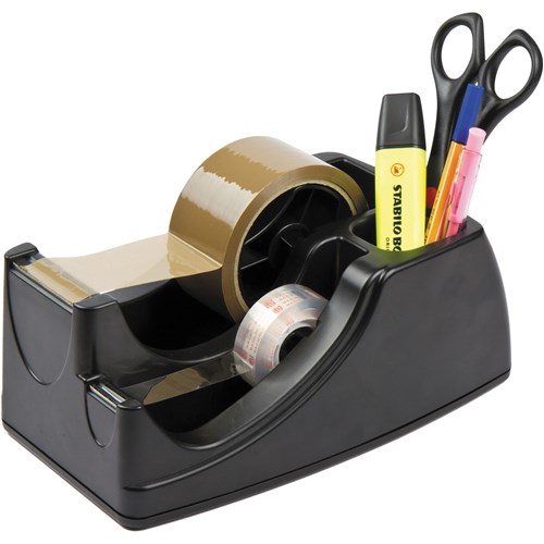 This dispenser has two spindles and a place to hold your pens, scissors etc. One spindle allows for you to dispense up to a 50mm wide tape, for example a packaging tape. The other spindle allows for a smaller office tape up to 19mm W x 33 Meters. Easily dispense both packaging and general purpose tape as you need it. Perfect for mail room, shipping department and sample room. Weighted base allows easy one hand dispensing. Made from 30% post consumer recycled material.