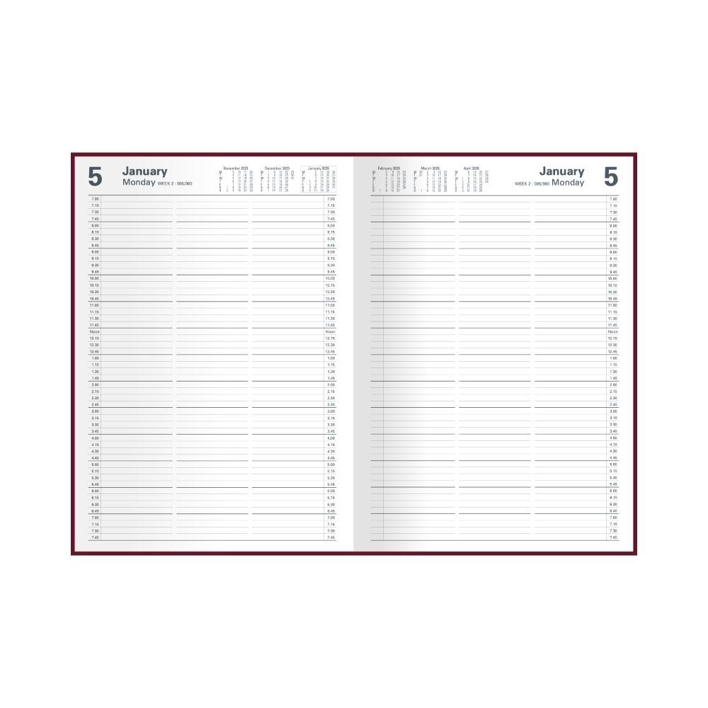 • Bound in a soft-look burgundy cover, section sewn for extra strength and with times printed clearly down each page.