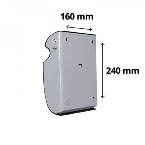 Durable powder coated finish. Liner with handle for easy emptying. Complete with mounting screws. Key for locking. Volume: 3.3 litres. Size: 240W x 95D x 320mmH.