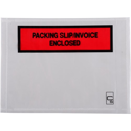 Superior grade adhesive and polyethylene prevent crinkling and sticking to itself. Standard size for packing slips. Black and red print 'Packing Slip/Invoice Enclosed'. White background. Top Layer 45 micron, bottom layer 35 micron, release paper 60gsm, adhesive 19-21gsm.