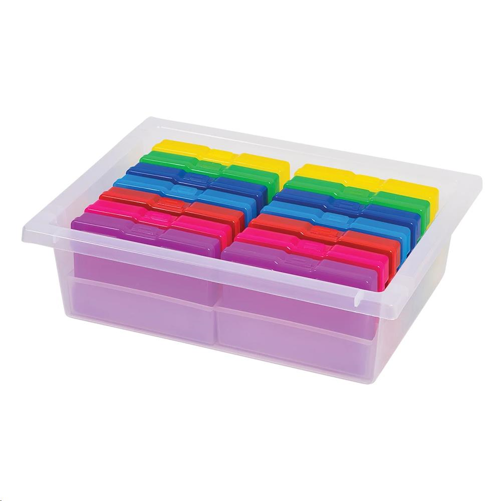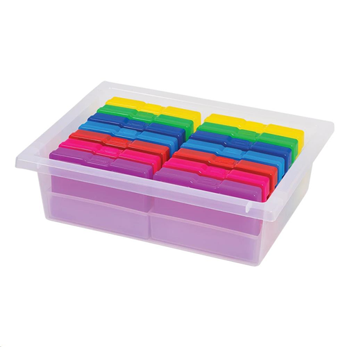 Description A great way to store and easily move small resources such as puzzle pieces, dominoes, flash cards, playing cards, STEM resources and so much more! Features: 14 colourful storage containers with snap closure that will protect and organise your resources.2 base frames to hold your rainbow storage containers neatly for storage.A clear tote tray with lid that perfectly holds both base frames and rainbow containers for easy movement of resources. Size: Each small coloured container measures 15.5cm W x 10.5cm D x 2.5cm HOverall tote tray size: 43cm W x 32cm D x 12.5cm H *Accessories pictured are not included unless specified above.