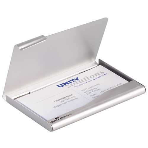 Portable and presentable storage option for business cards. Single slimline aluminium box holds up to 20 business cards. Inside dimensions 90 x 55mm.