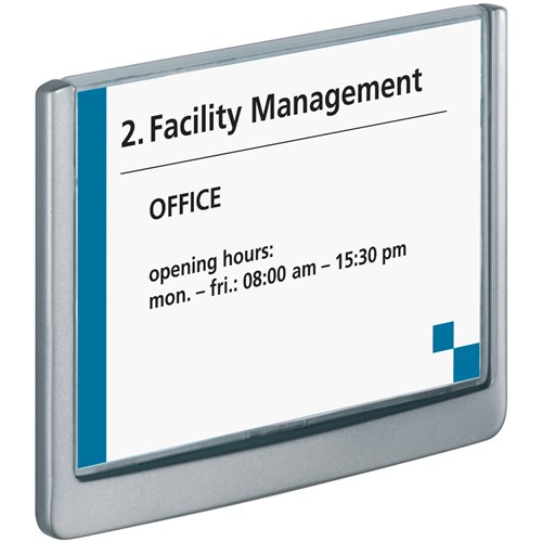 Plastic door sign with easy exchange of inserts through complete extraction of the viewing window. Suitable for large-scale applications such as in educational institutions, hospitals, restaurants, etc. Comes with assembly kit, drilling template and instructions.